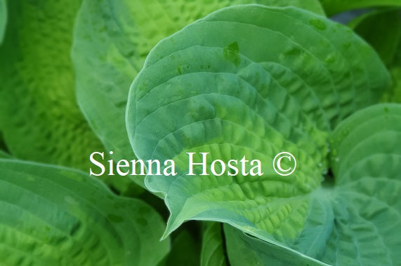 Hosta Academy Blushing Recluse has large green leaves with a yellow gold margin. The veins are prominent. An elegant large hosta that can be planted...