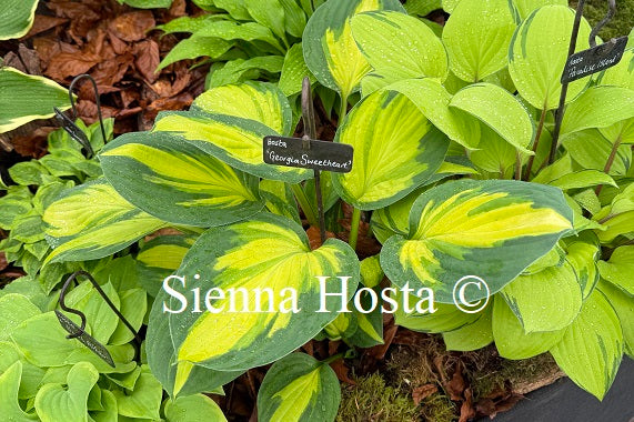 Hosta 'Georgia Sweetheart' has beautifully vibrant yellow leaves with two toned green margins. As it matures, 'Georgia Sweetheart' becomes lighter in the centre. Ideal for a container in partial shade.
