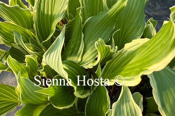 This medium variety has green leaves and a very rippled white margin. Can be grown in the ground or a pot.