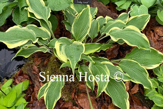 Hosta 'Lady Luck' had slender satin green leaves and a cream white wavy margin. It also has red stems, another beautiful feature of this stunning variety. Can be grown in the ground but best in a pot where the stems can be shown off and it can be protected from slugs and snails.