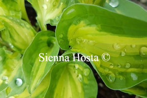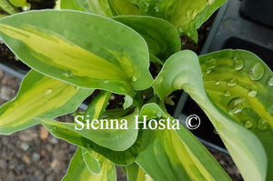Hosta 'Island Charm' has splendid yellow cream leaves and blue green margins. The flowers are lavender.