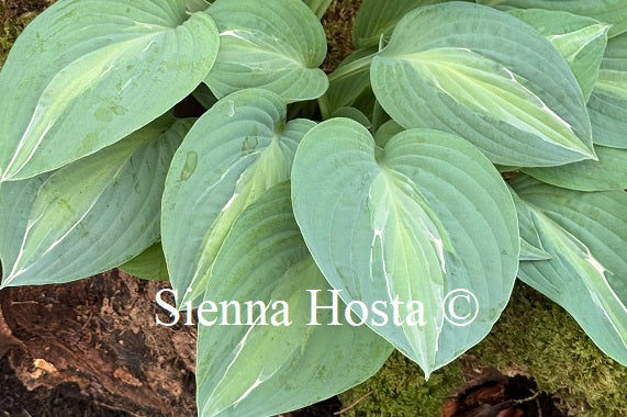 Hosta 'Kiwi Full Monty' is a very popular variety and one of the best 'Striptease' sports there is. The leaves are light blue green with white streaks in the centre, the margins are a darker green. A very nice hosta.