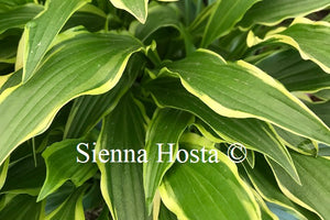 Hosta Stiletto is a strong growing small hosta. The leaves are green with a thin rippled yellow margin. Stiletto forms an impressive clump and looks particularly nice planted in groups.