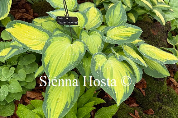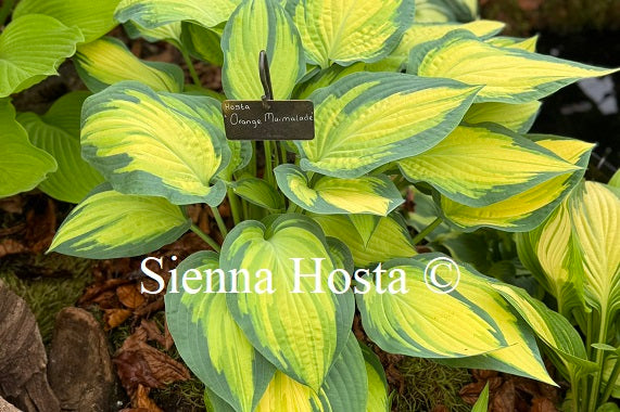 Hosta Orange Marmalade is a truly must have hosta. It's leaves are a stunning yellow orange leaves and dark blue green margins. The centre of the leaves turns lighter throughout the season.