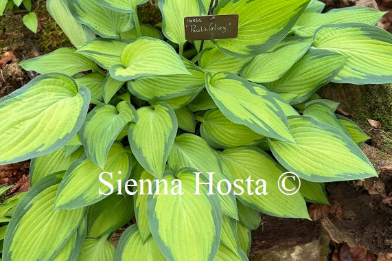 Hosta Paul's Glory can be found in most good hosta collections, an extremely popular large hosta and a good grower. It comes out with more green leaves, then sets to the more yellow fusion of colours. Hosta of the Year 1999.