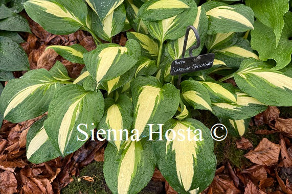 A lovely bright variety. Yellow centre which turn white later in the season, wide green margins.
