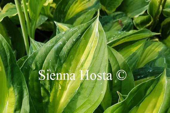 A lovely sport of 'Striptease' with the signature white between the margins. Yellow centre and a green margin.