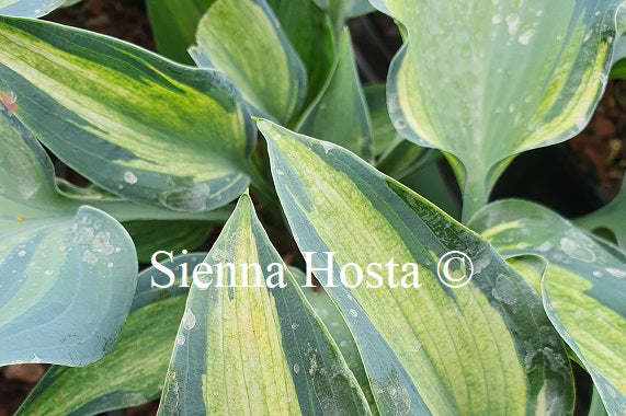 Stunning creamy white centre and blue margins. A sport of 'Halcyon' but a slower grower.