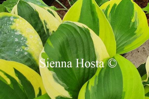 One of our new favourites. Bright rich green leaves and a beautiful yellow margin. A very lovely sport of 'Whirlwind'. Lavender flowers make a nice balance to the creamy edges of the leaf.